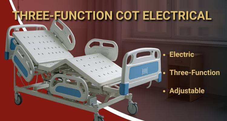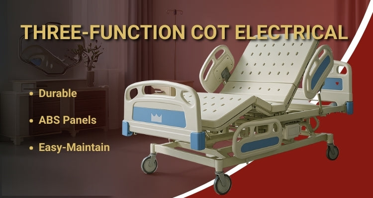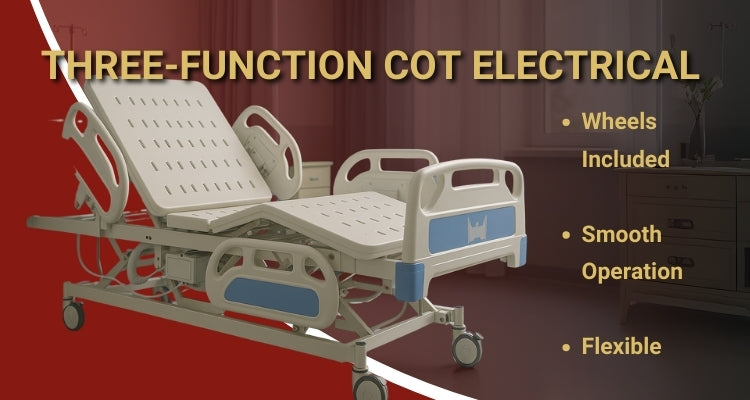 The SG Well Care Three Function Electrical Cot is designed for enhanced patient comfort and ease of use with electric adjustments for backrest, knee rest, and Trendelenburg & Reverse Trendelenburg positioning. Featuring durable ABS panels, this electrical cot provides smooth, effortless operation and is ideal for hospitals and healthcare settings where patient care and comfort are paramount. The cot is also equipped with wheels for easy mobility and can be conveniently adjusted to different positions with just a button press.